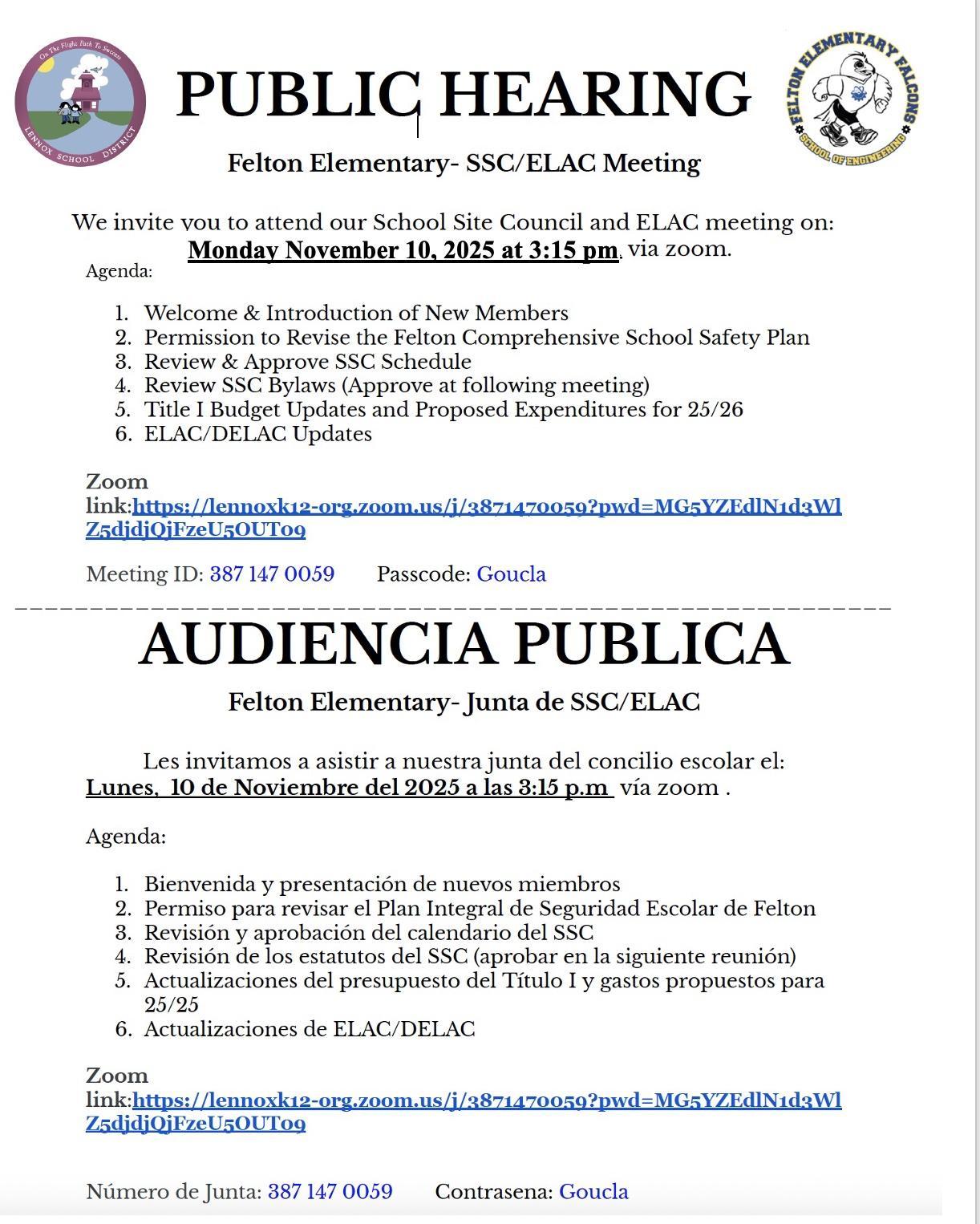 SCC Meeting / Junta de Concilio Escolar